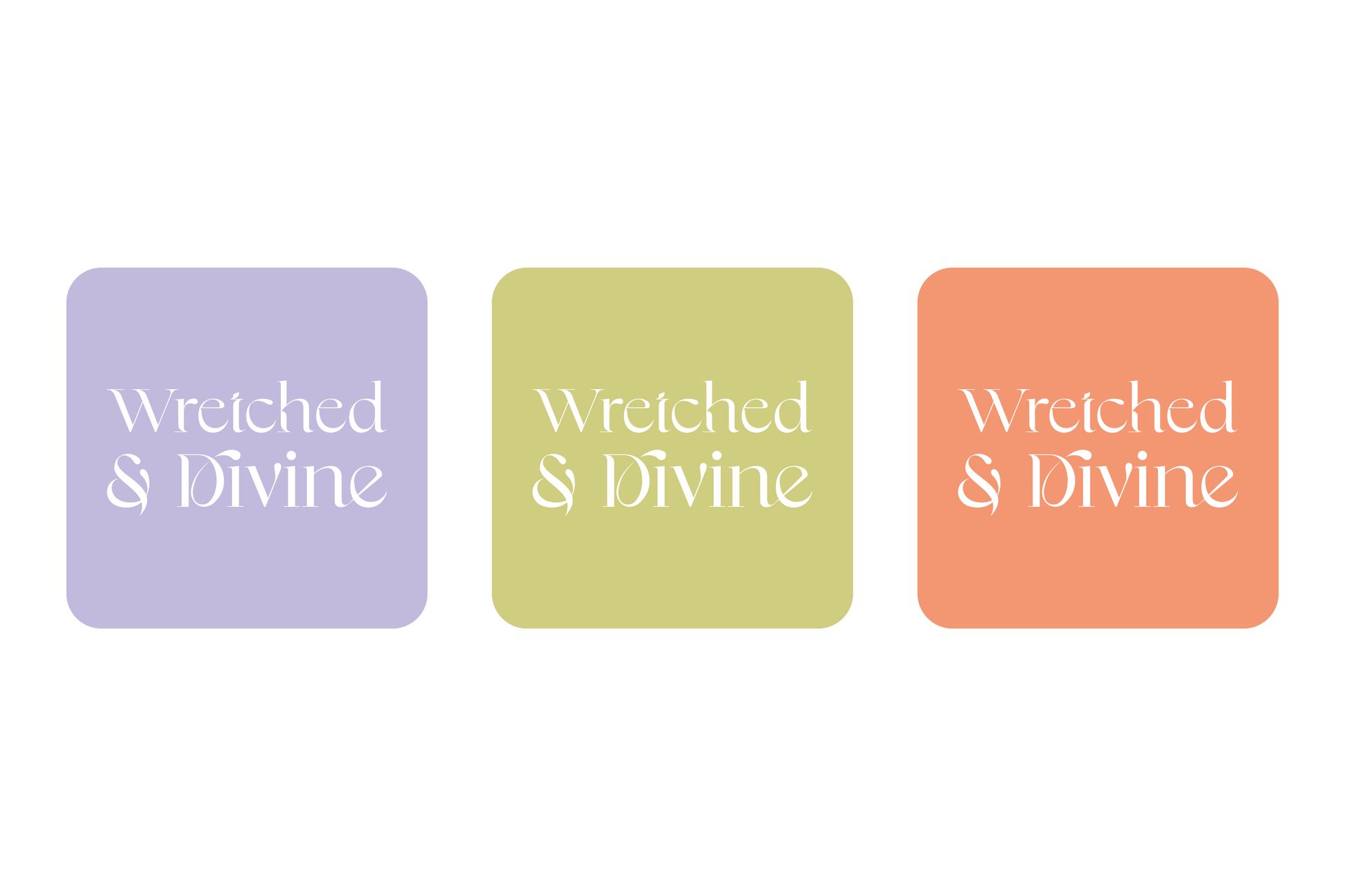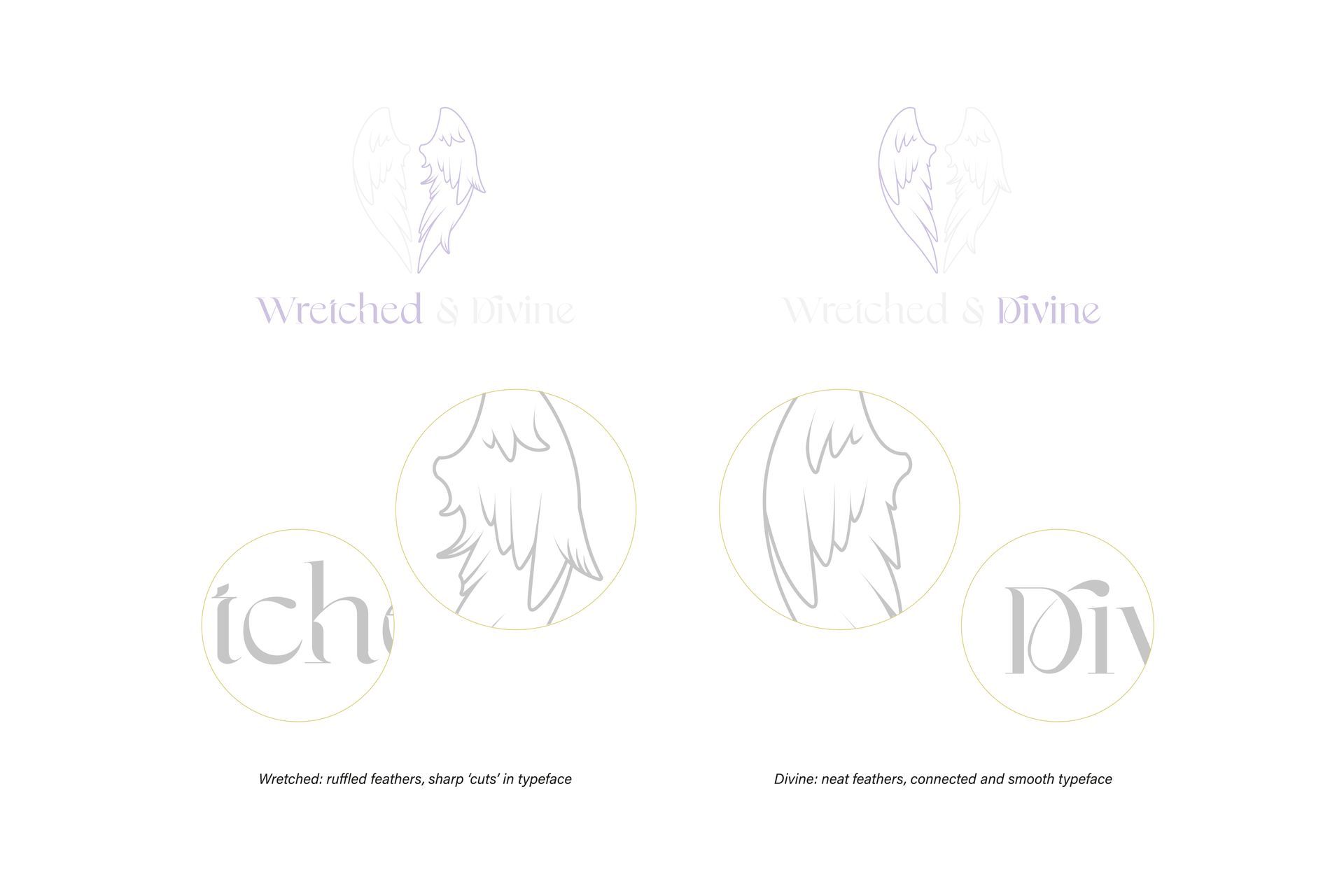 Above and opposite to the words Wretched & Divine, is a pair of wings - one with neat feathers and the other with ruffled feathers. This depicts that even within the most beautiful, something grim hides. And within the wretched is always something divine to be found. This is further explored in the logo type where I altered an existing type to create the same distinction.