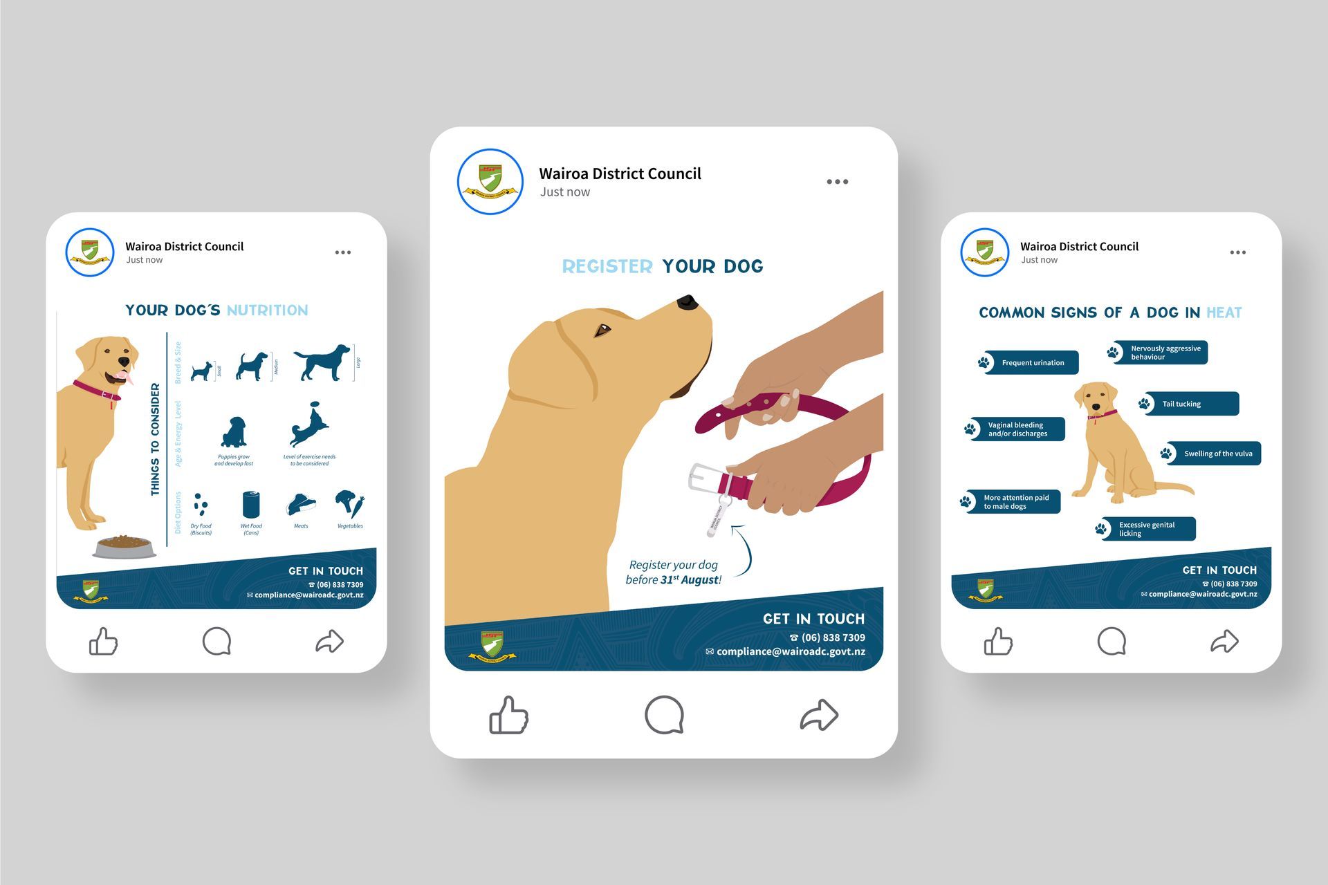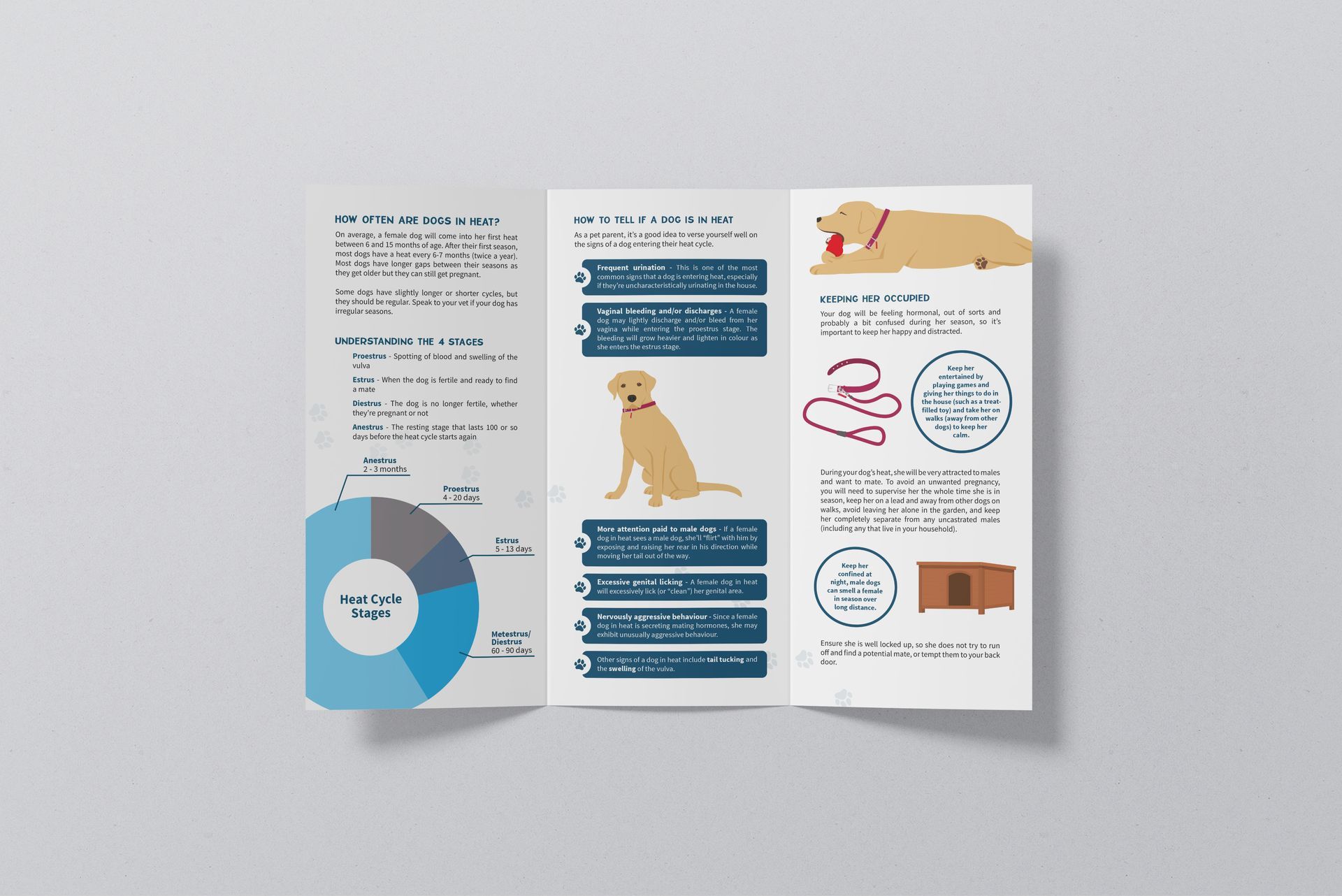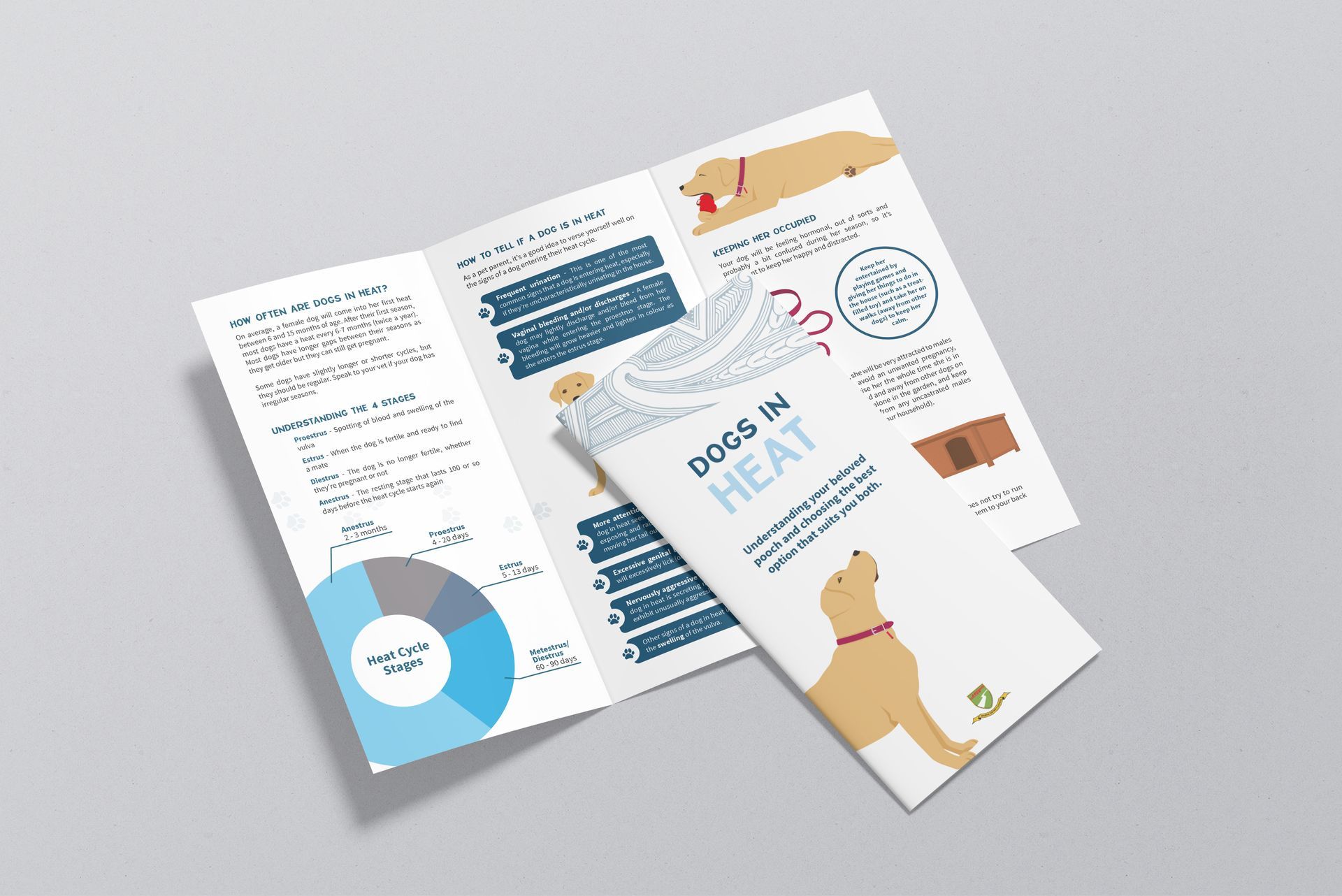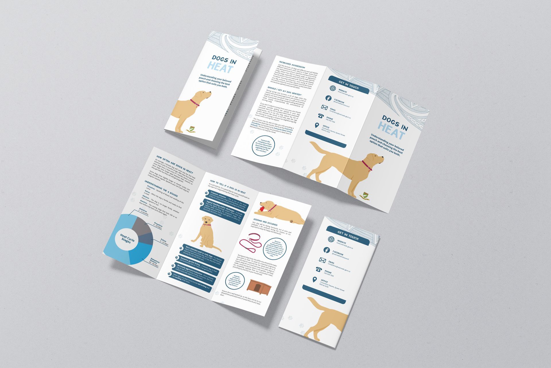 I was given specific subjects and content and worked closeky together with the animal control team to create cohesive collateral: a Dogs In Heat brochure and nine images for Facebook, covering a range of topics. I delivered the final brochure including graphics and improved on the content provided by the client to ensure it would resonate with the target audience. I coordinated production of the flyers and supplied the Facebook images with a description, so the client could roll out their new collateral